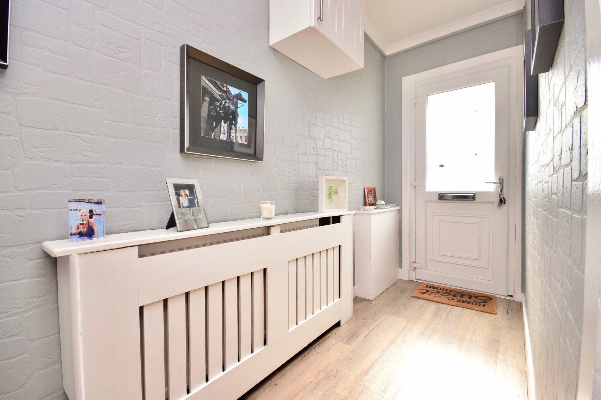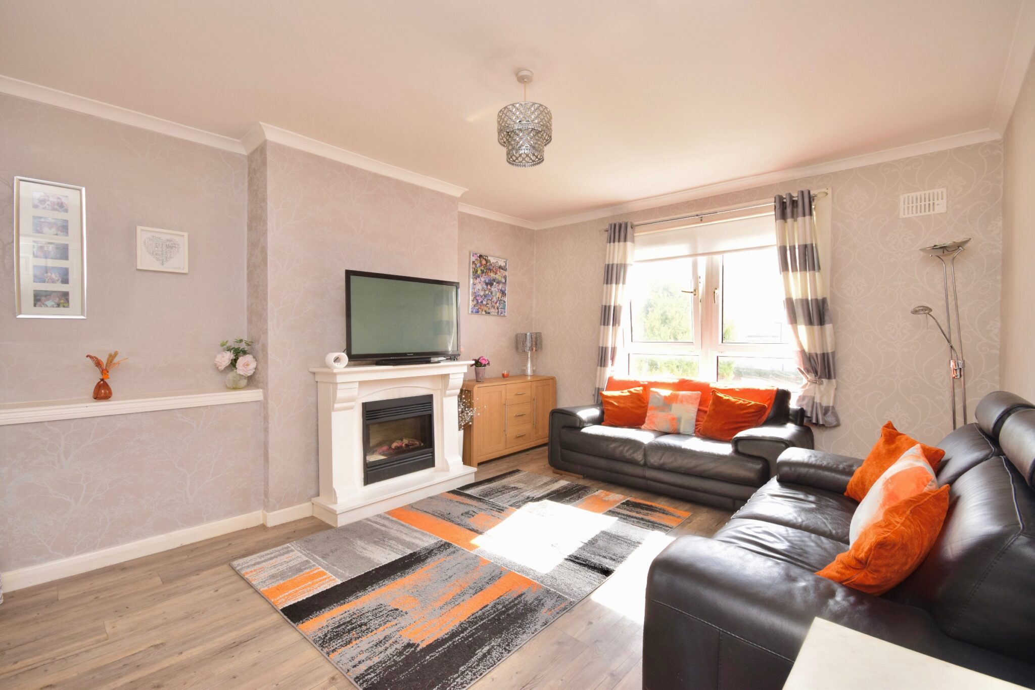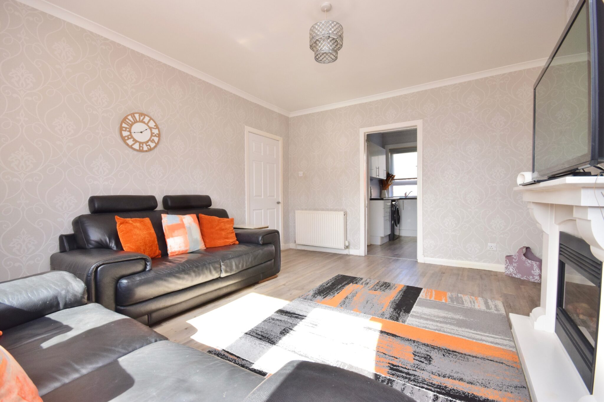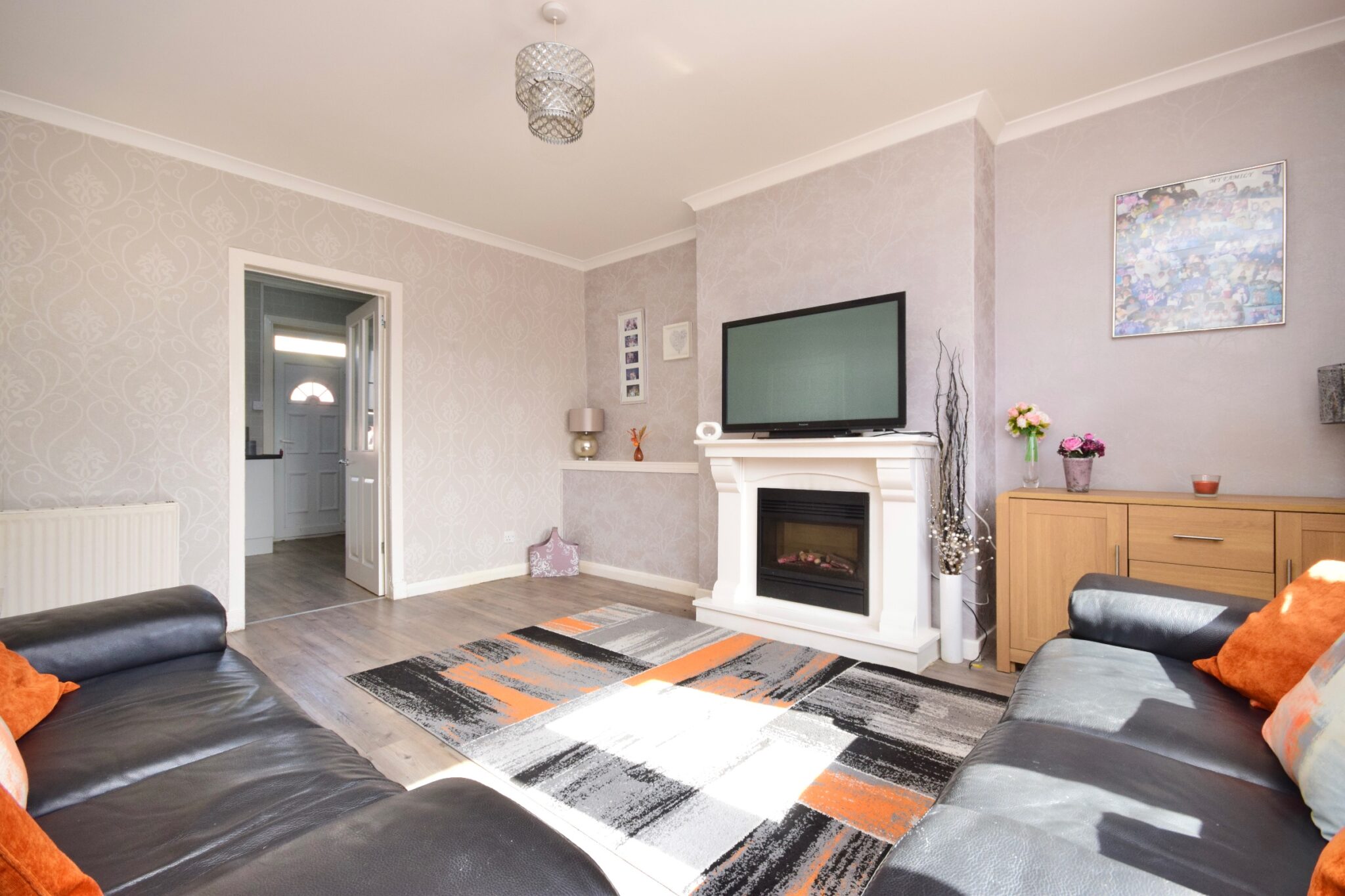 The accommodation in full comprises: an inviting reception hallway which leads into a bright and spacious living room with a feature fireplace, a rear-facing kitchen with a range of wall and floor-mounted units with space for appliances and a built-in storage cupboard, and a three-piece family bathroom with a walk-in shower cubicle. There are two excellent double bedrooms, with both including built-in storage space.
